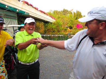 2012_champsKeano and Junior bounced back from a triple-bogey on #15 to finish birdie, net par, net birdie and outlasted Hedgehog, Angel and Papi-san (aka Dicky Growler) for a thrilling playoff victory in the 13th Annual Hairy Crab Invitational.  After tying at -23 in regulation, Junior found the 18th fairway and Keano hit the green to secure a winning bogey over their wayward opponents.
