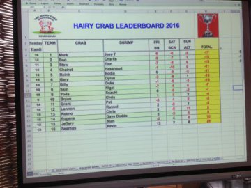 Long time partners, Pinhead and Joey T started the week at the fabled Long Bar Reunion Party and ended it claiming Crab glory. The longest tenured Barbeereans, slogged thru a soggy Sunday to shoot a day's best alternate shot 67 reeling in Boom Chuka Lucka and Big Bear Charlie on the final hole.
