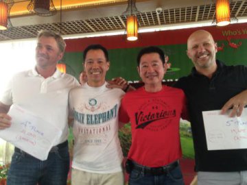 Boom & Charlie road Boom's off-the-stick first round 71 to lead the tourney for 53 holes. But like many before them, on Sunday, met their demise in the Spring City Mountain Course's 18th hole ravine. B&C finished tied for 2nd with Hedgehog/Bama Tom two shots back. Rienk/Eddie and and the Thai boys Chariat/Hasanand rounded out the money winners in a 4th place tie a further four adrift.